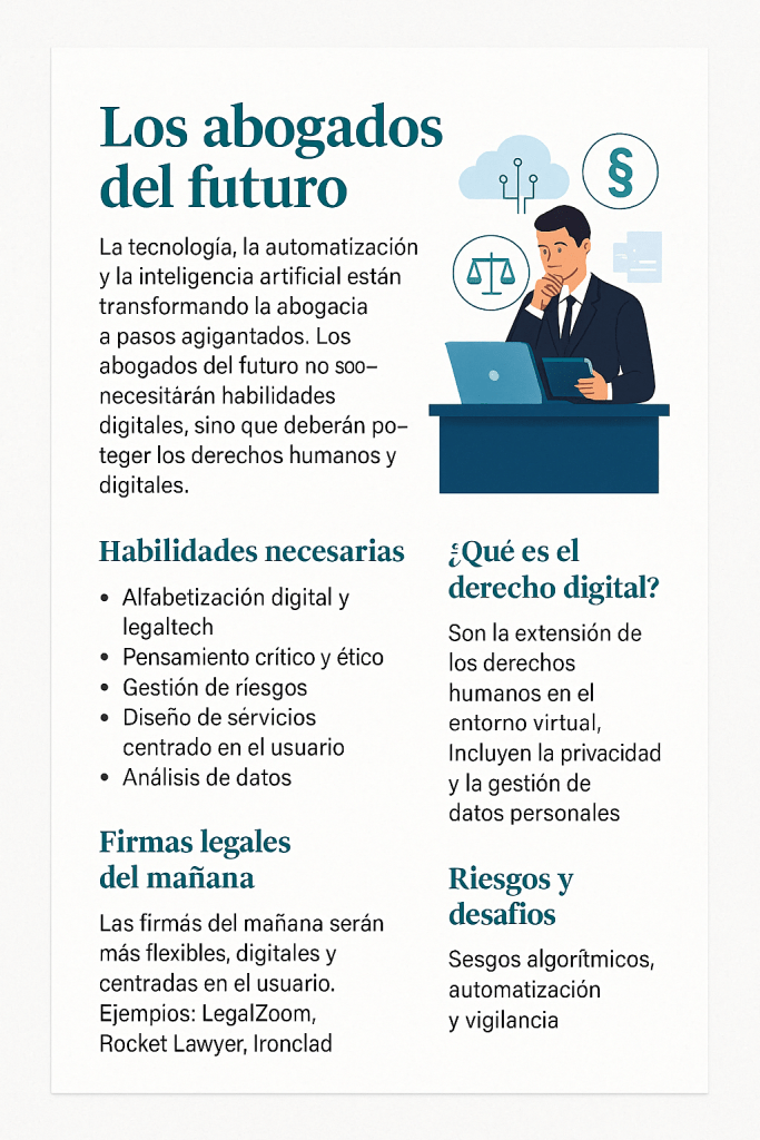 En este contexto nace una figura clave: El Abogado del Futuro. No es simplemente un profesional con conocimientos legales, sino un agente de cambio que entiende el lenguaje de la tecnología, gestiona herramientas digitales, y pone los derechos humanos y digitales en el centro de su ejercicio.
