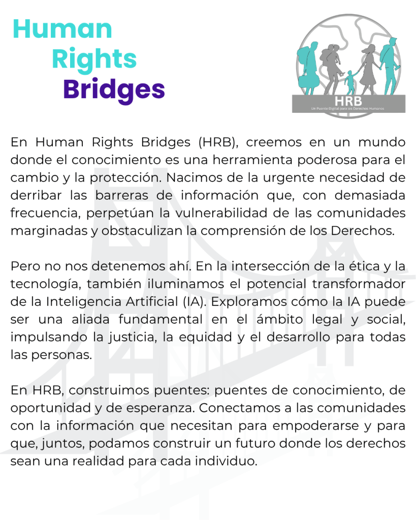 Human Rights Bridge (HRB) es una organización liderada por profesionales del Derecho y Defensores de Derechos Humanos, apasionados por la justicia social, la educación y la tecnología. Nuestro trabajo surge de la certeza de que el desconocimiento es una de las mayores amenazas contra los Derechos Humanos. Por eso, creamos un enfoque transformador que combina educación accesible, tecnología responsable y una firme convicción de justicia. Promovemos soluciones que integren la IA con una perspectiva ética, centrada en las personas, para acompañar a comunidades vulnerables, profesionales del derecho y defensores/as en su camino hacia el empoderamiento. Trabajamos para la defensa y protección de grupos minoritarios, en situación de riesgo, incluyendo a la sociedad civil y a los defensores y defensoras de derechos humanos, brindándoles herramientas para enfrentar desafíos, ejercer sus derechos y generar impacto desde el conocimiento y la innovación.